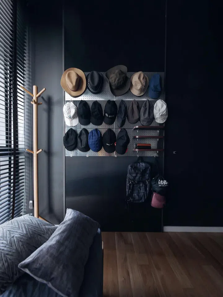 The guest room not only boasts black aluminium blinds, but also a metal peg board that allows berets, caps and bags to be displayed.