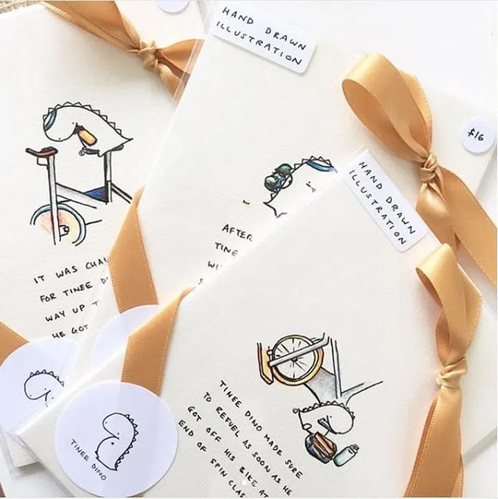 Rachel, who studied journalism, has always enjoyed sketching and painting in her spare time. But it was only in January this year that she began posting about Tinee Dino on Instagram, sharing daily musings and vignettes of his life, inspired by her own observations. The response to her rotund creation was positive, and this encouraged her to take her work offline. At her first art fair two months later, Rachel sold more than 20 drawings in a day, and decided to take the leap into illustrating full-time.