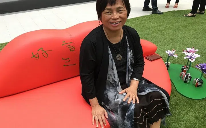 46 vibrant-coloured flowers were handcrafted from treated aluminum foil and decorated with lipsticks that were donated from the public. Titled, “No Indecent Assault in Speech”, the artwork strives to send the message of “doing good deeds, speaking kind words and harbouring good thoughts”. To convey this message, Ms Chng designed three lip shaped sofas with Chinese inscriptions on it to highlight the importance of being careful with words.