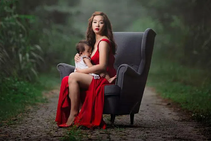 One set of photos shows a woman in office wear breastfeeding her baby at Raffles Place, while the other is of another woman, dressed in an evening gown and high heels, breastfeeding in a forested area.
