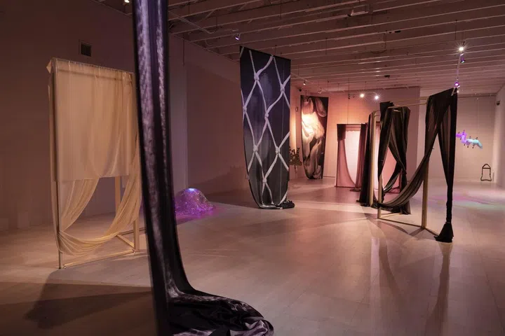The abstraction in her most recent installation begins with its very name – “sft crsh ctrl”. The work is a sequence of cascading silk twill, latex sheets and faux fur draped over frames that billow from the ceiling. And it is a deliberately confusing work. (Read: You’re not supposed to get it… maybe.) Her oeuvre questions everyday problems and challenges viewpoints. Perhaps that sense of “I’m not sure what to make of it…” is part of the work’s appeal.
