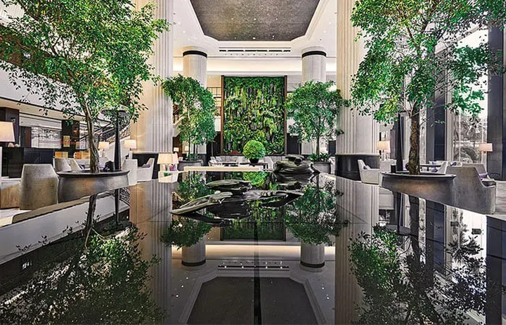 Guests lounging in Shangri-la Hotel’s Tower Wing can be forgiven for thinking they hear birds chirping or the rustling of leaves – the revamped space is designed to bring the outdoors, indoors. From the 9m-high rock and vegetation feature wall, to the potted trees and black reflective pool, every element in the lobby is intended to elicit calm. The art, whimsical and nature-inspired, only enhances this effect.