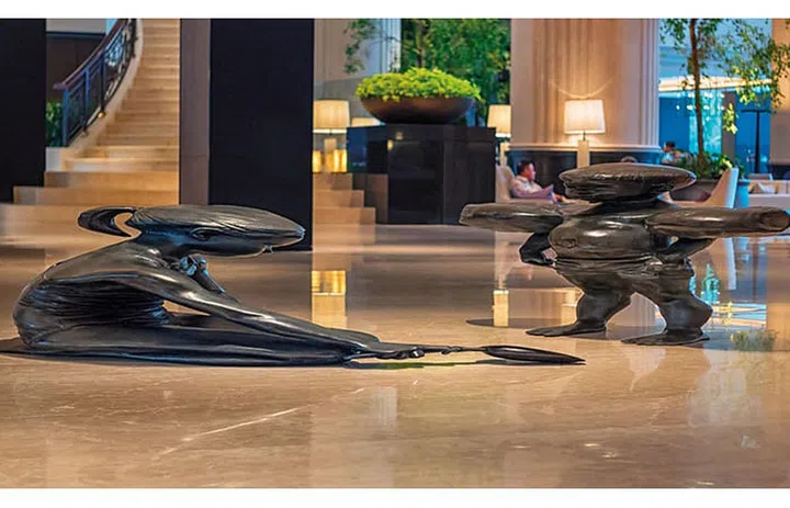 Guests will no doubt snap photos of South Korean sculptor Yi Hwan Kwon’s Children Dabbling In The Water. Where Botero’s sculptures are bulbous and Giacometti’s emaciated, Yi’s are vertically crushed. The figures, one of which is shown emerging from the reflective pool, inject the space with playful elan.