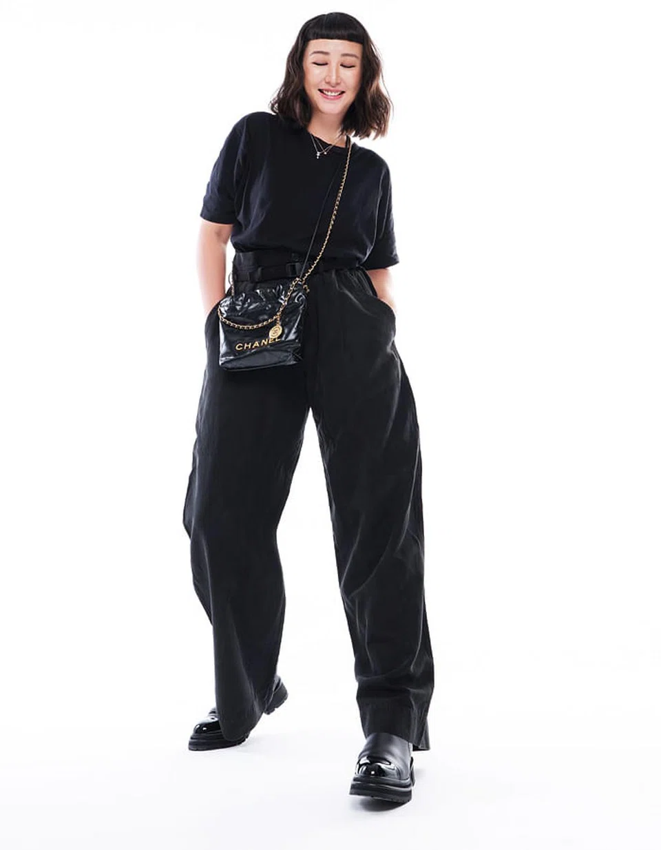Chanel 22 mini handbag with chain sling, Coco Crush beige gold necklace, and Eternal No.5 white gold necklace with diamonds, Chanel. T-shirt, pants and boots, Rozz’s own