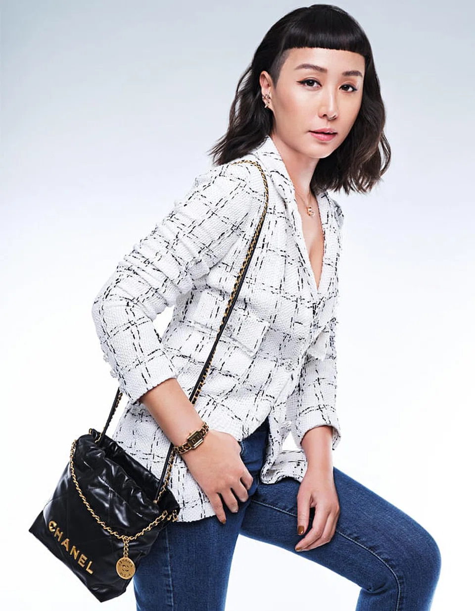 Tweed jacket, Chanel 22 mini handbag with chain sling, Coco Crush beige gold single earring, Coco Crush beige gold necklace, Eternal No.5 white gold necklace with diamonds, and Premiere watch, Chanel. Denim jeans, Rozz’s own