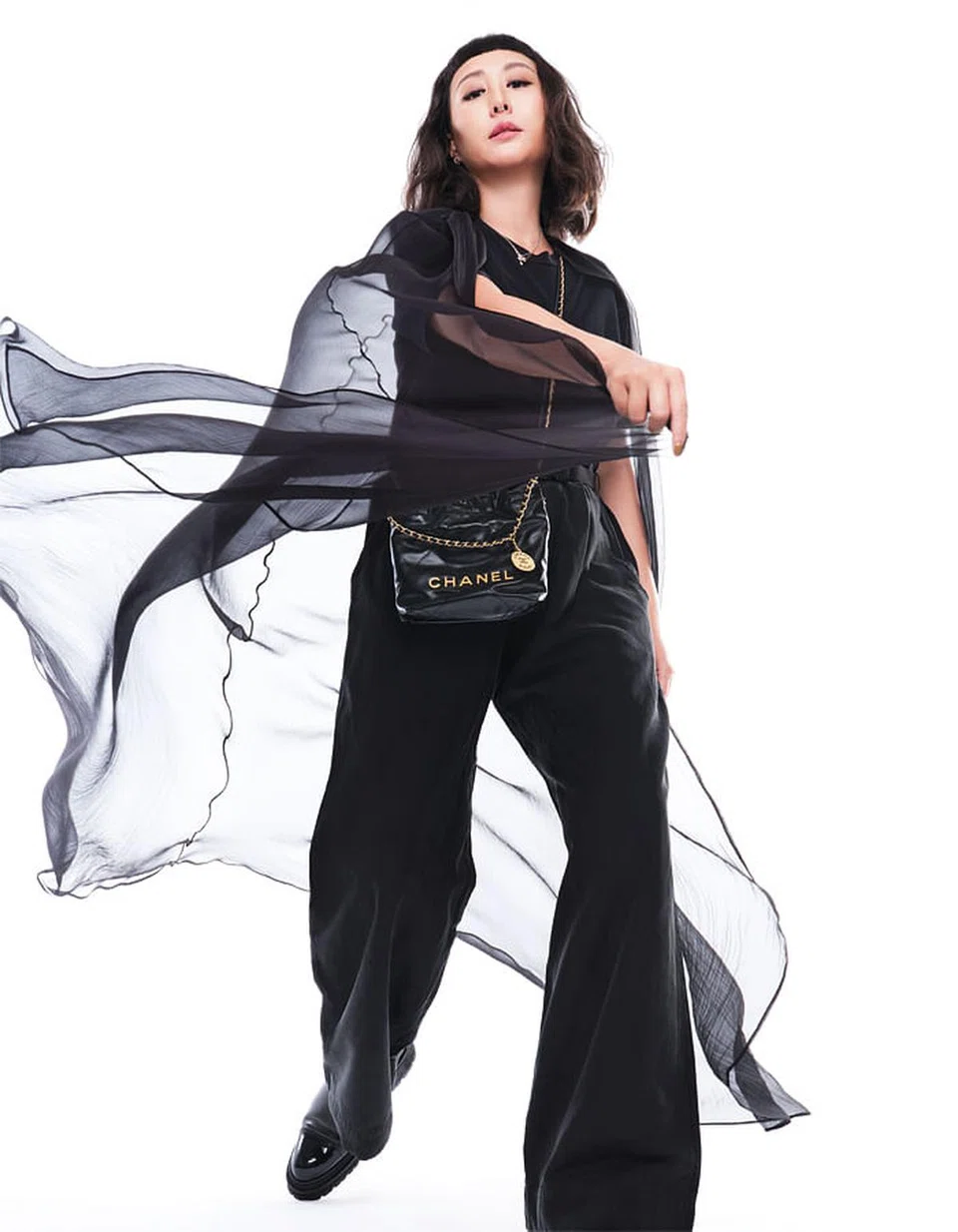 Sheer cape, Chanel 22 mini handbag with chain sling, Coco Crush beige gold necklace, and Eternal No.5 white gold necklace with diamonds, Chanel. T-shirt, pants and boots, Rozz’s own