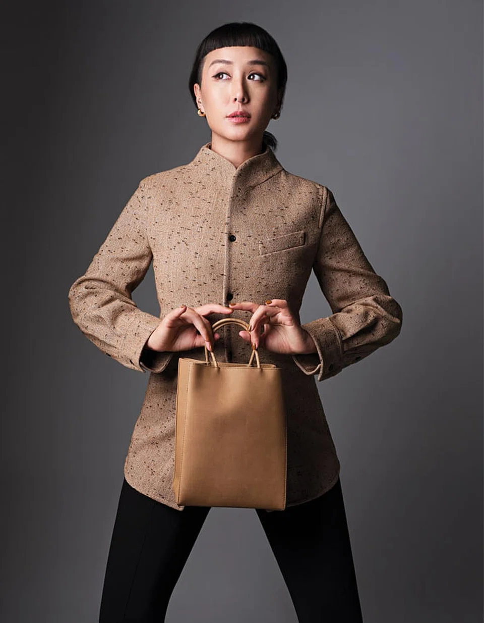 Mandarin collar jacket, leather tote, and gold hoop earrings, Bottega Veneta. Leggings, always adopt. The thing Rozz’s own