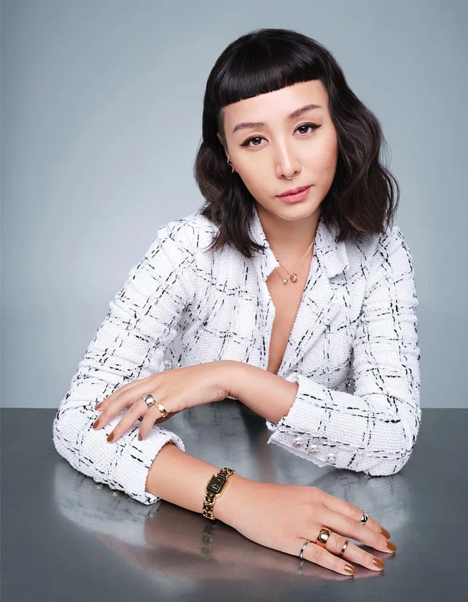 Tweed jacket, Coco Crush beige and white gold necklaces, assorted Coco Crush white and yellow gold rings, and Premiere watch, Chanel