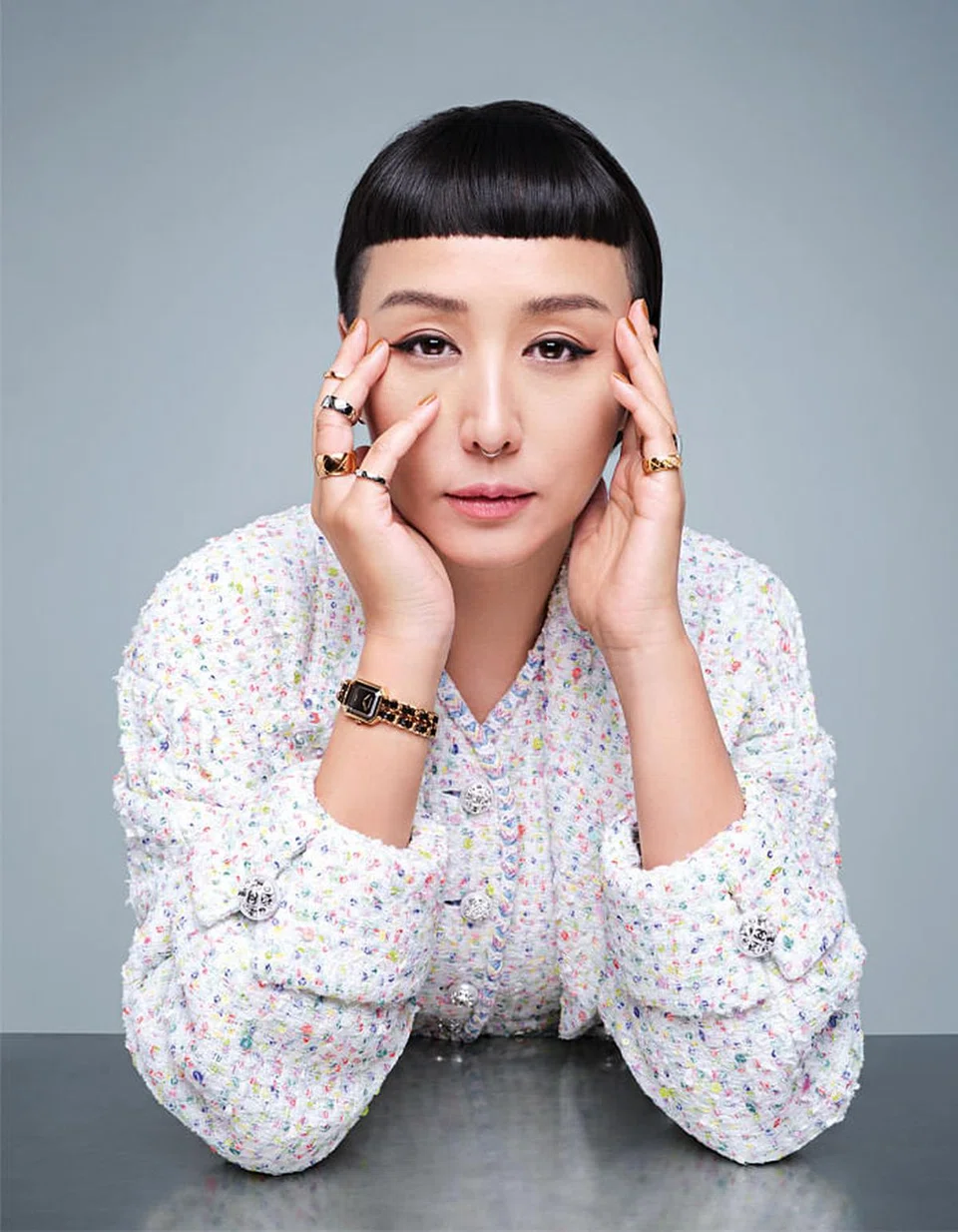 Tweed jacket, assorted Coco Crush white and yellow gold rings, and Premiere watch, Chanel