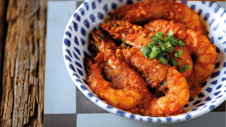 The Udang Nonya, which features tiger prawns sauteed with preserved bean paste and chilli, is a speciality dish at The Blue Ginger