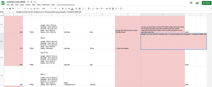 Together with my cousin, we came up with our inventory sheet. Then, we listed and measured all the items and filled in our listings with descriptions and prices. As the majority of my items are pre-owned, I pulled up FarFetch, Tradesy, Vestiaire, Depop as well as the designer’s website to accurately access how these pre-owned items could compare to retail and vintage prices.