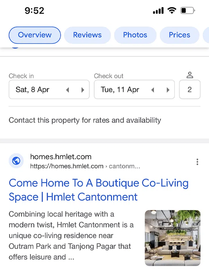 Just as I was about to book though, their Owen place ad popped up again, this time on my TikTok- but advertising it as a hotel. I was a little confused because I thought they were a co-living company, so I checked in with them, and they replied that the Owen site is actually a hotel so, sadly, I had to pass on it, as the focus of this series is co-living in Singapore and not hotel staycation in Singapore. (Although I’d like to drop a gentle hint to my editor here and inform him that I would be more than happy to write on hotel staycations in Singapore!)
