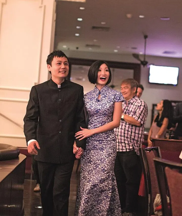 Wan Ting and Desmond wore oriental-style outfits for the march-in to dinner. She had on a beautiful blue cheongsam, and he, a smart black suit with a Mandarin collar.