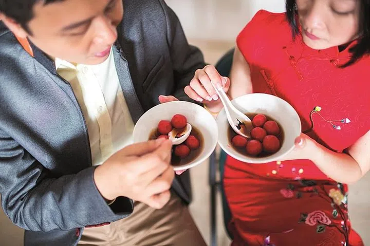 Red was everywhere - from the bride's cheongsam (see second pic) to the glutinous rice balls, ring box and reception table decor. Marquee lights in the form of the Mandarin character for double happiness, vintage fans (electric and paper), ornate porcelain vases and old-school prints added to the vintage charm.