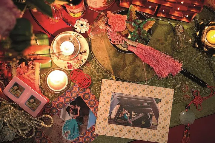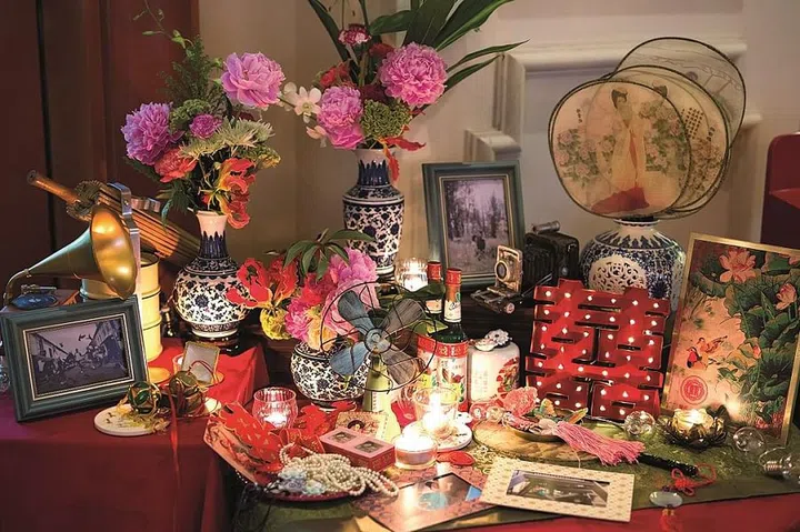 The reception table featured Chinese and vintage elements, including jade charms, the couple's engagement photos in vintage-patterned frames, Chinese knots, double happiness stickers, and posters and prints.