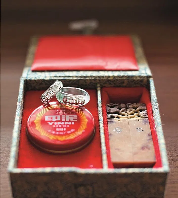 The ornate ring box featured a pair of jade rings and Chinese seals.