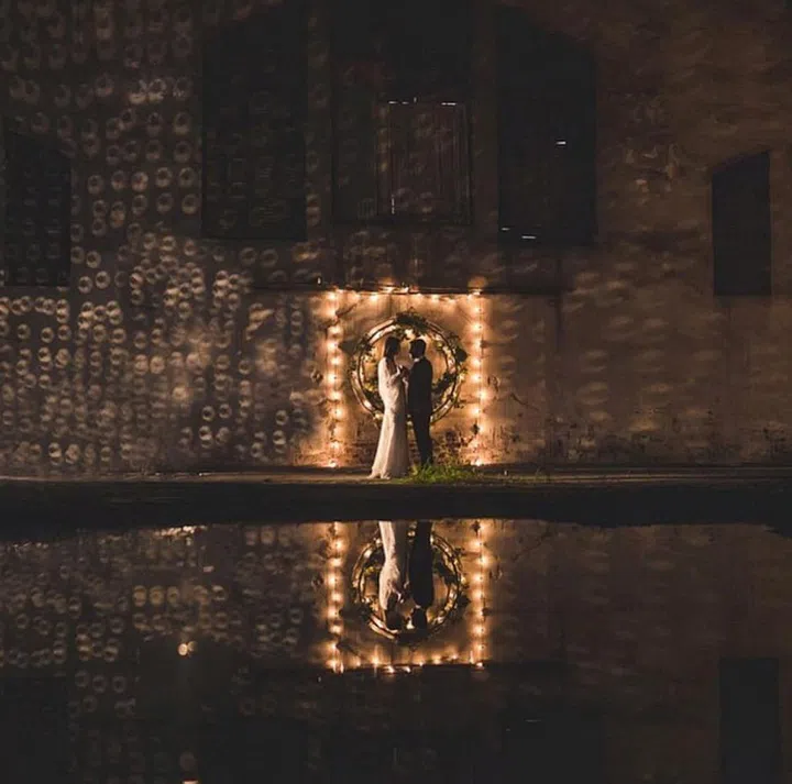 The glowing lights of this arch looks twice as enchanting reflected in the water.