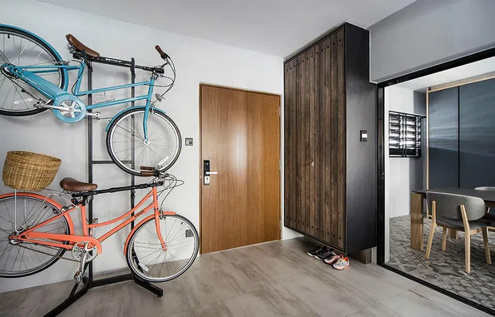 The homeowners' bicycles act as decor, and there's space for storage, too.