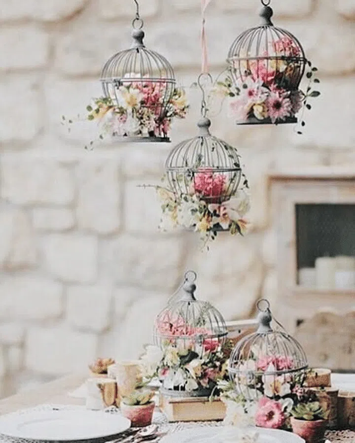 Hanging birdcages filled with pastel flowers add such a delicate touch to the venue. See also: 8 fun & easy wedding decor ideas you can DIY.