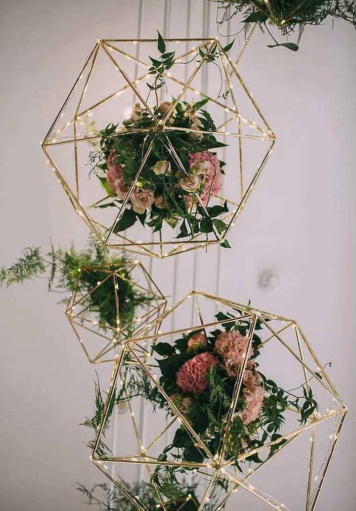 Gold geometric installations with greenery and flowers in them, like these ones, have us all starry-eyed!