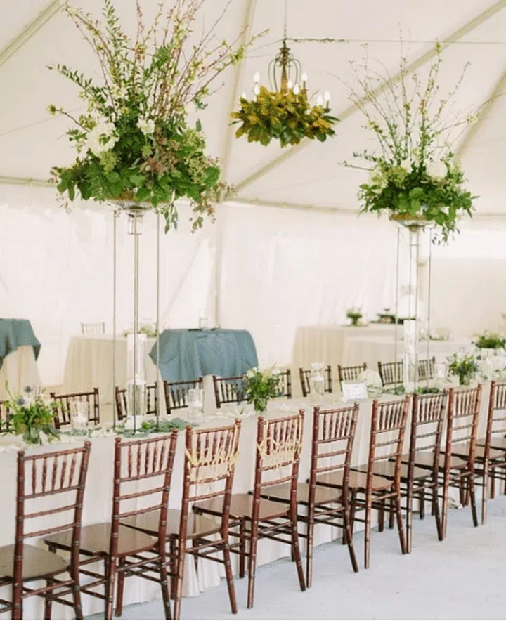 We love how the greenery looks against the white tented backdrop. The floral design is by Cabbage Rose Florist.