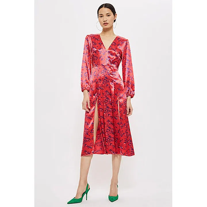 Date night just got sexier with this lustrous red number. The lowered neckline and the multiple slits are great ways for beating the heat and amping up the sensuality.