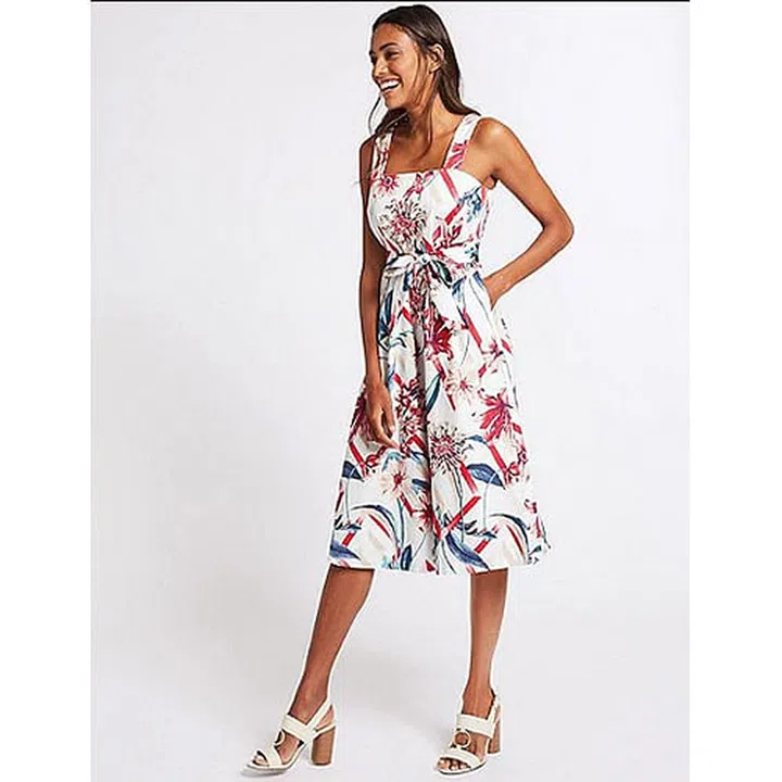 You're looking at the perfect dress for a sunny weekend out. The vibrant florals and the bursts of bright colours are perfect companions for your off-duty style, and the cotton is breathable and easy to wear.