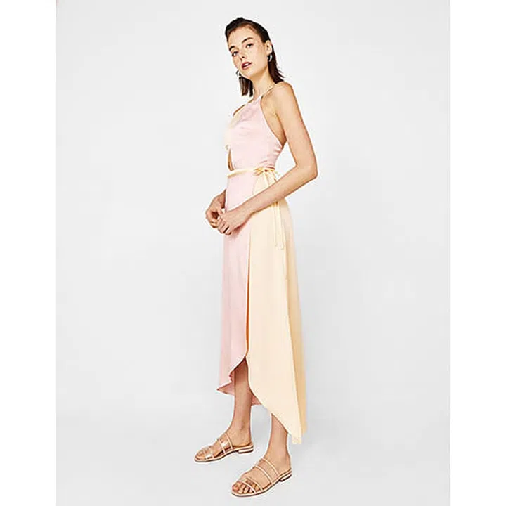 With its subtle drapery and its deep V-neckline, this silky dress hits all the right spots with its ability to help you look great and keep your cool.