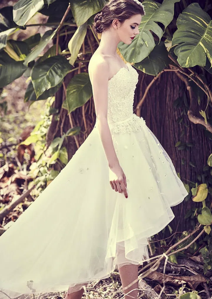 Good news for the petite bride: A high-low hem can make your legs look like they're going on for miles - with heels on, of course. This dress with delicate floral appliques fluttering dreamily down the length of it is just right for floral-loving brides with a smaller frame, too - bigger rosettes can overwhelm you.