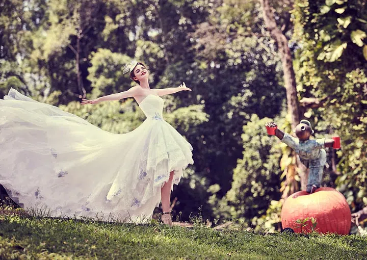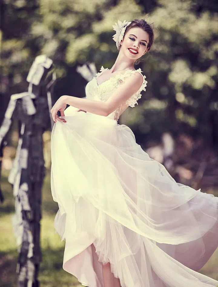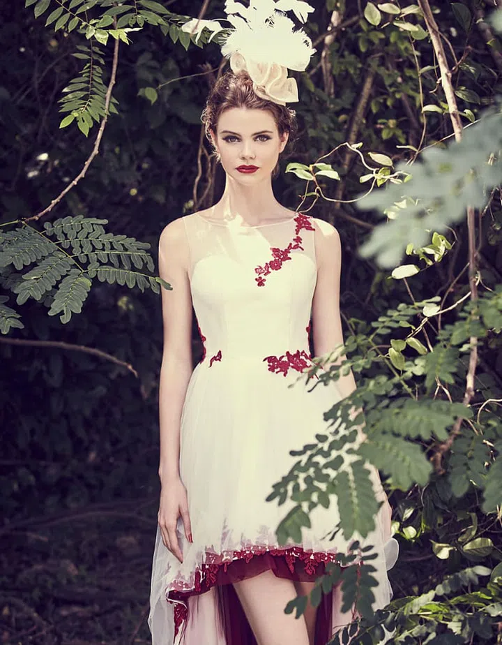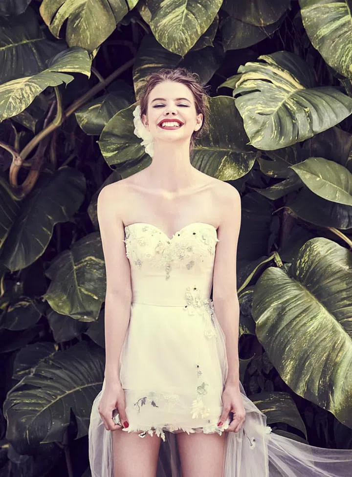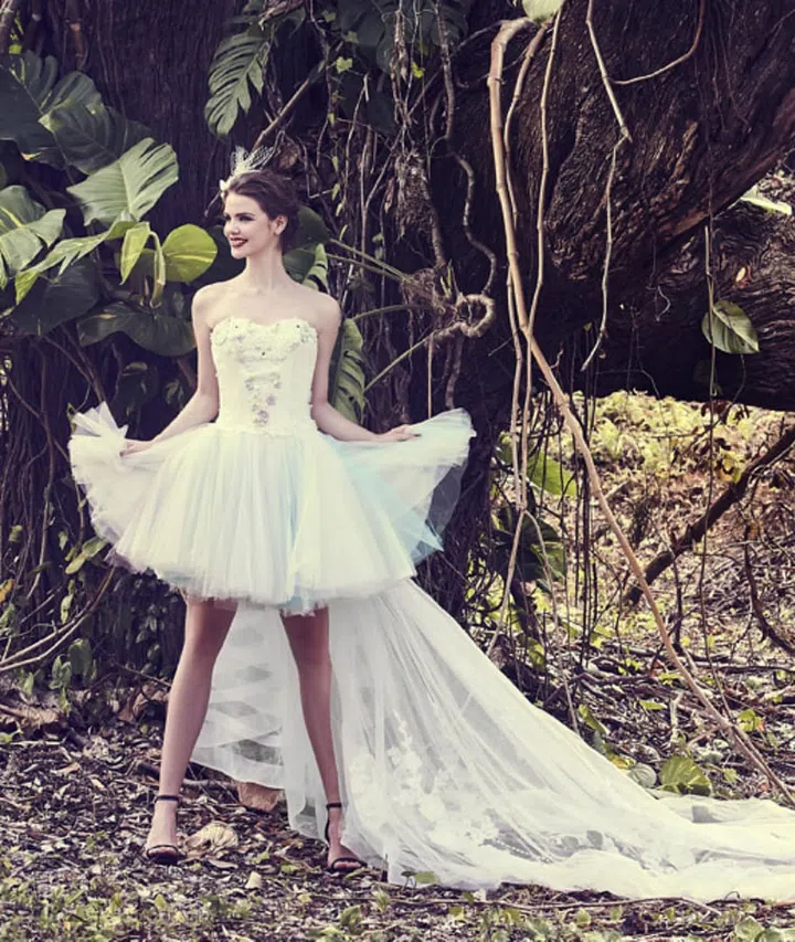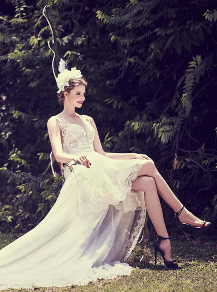 Instead of a regular high-low hem, you can also opt to attach a long gossamer train to a short wedding dress.Top with a fluttery netted fascinator and you're all set for a whimsical Alice-in-Wonderland-esque celebration.