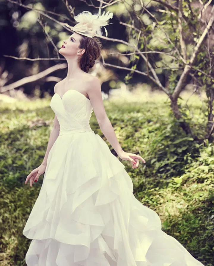 If you're into a fuss-free look or simply looking to cut the cost of your wedding dress, skip the embellishments. Instead, dress up your look with textures, pleats, tiers and ruffles, as well as accessories, like a statement headpiece.