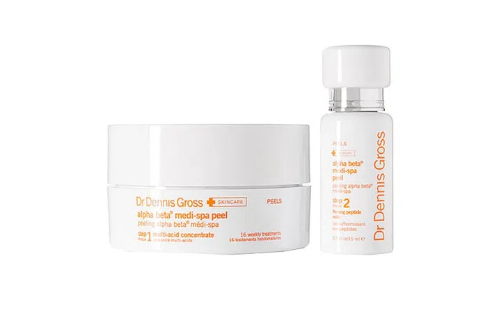 This two-step regimen includes 16 pads infused with exfoliating Alpha and Beta Hydroxy Acids, as well sa a milky peptide finishing step to weaken the connection between dead cells. Used once a week, it leaces you with firmer, more hydrated and radiant complexion.