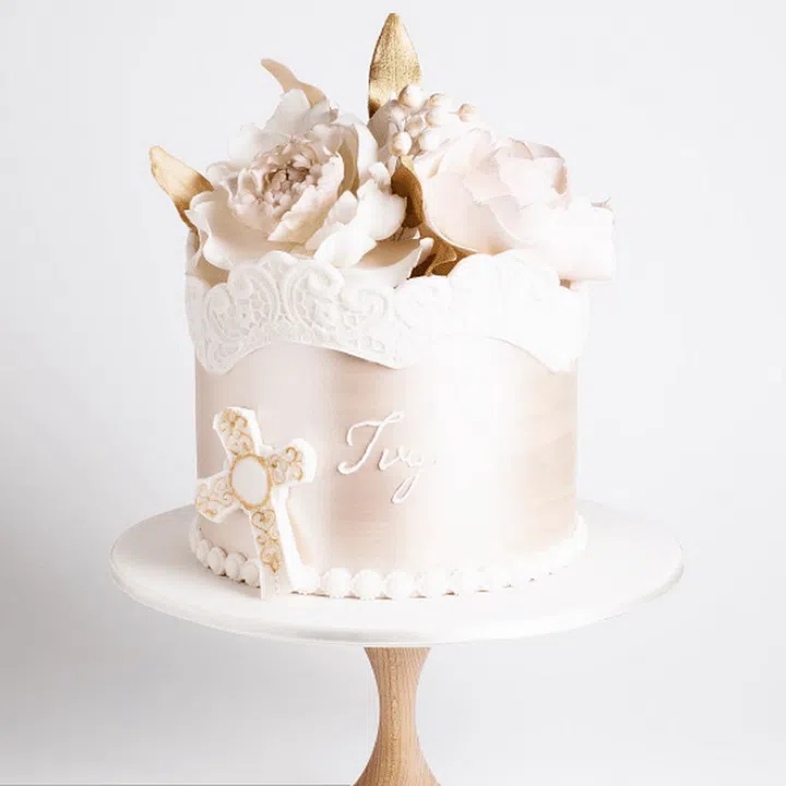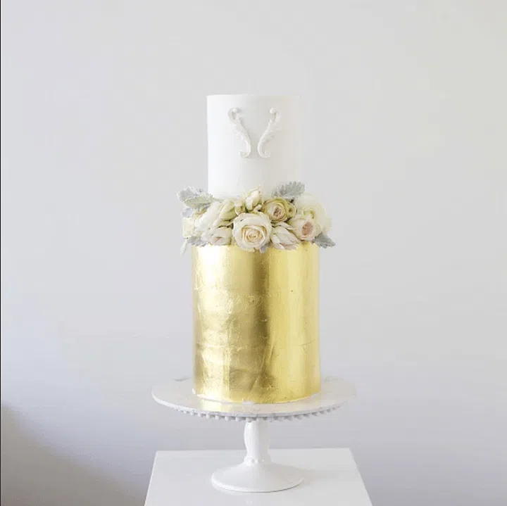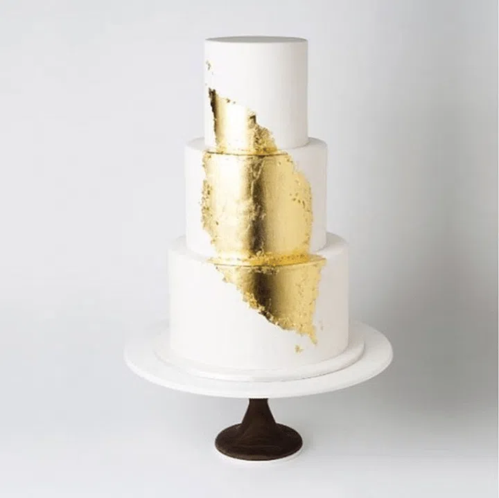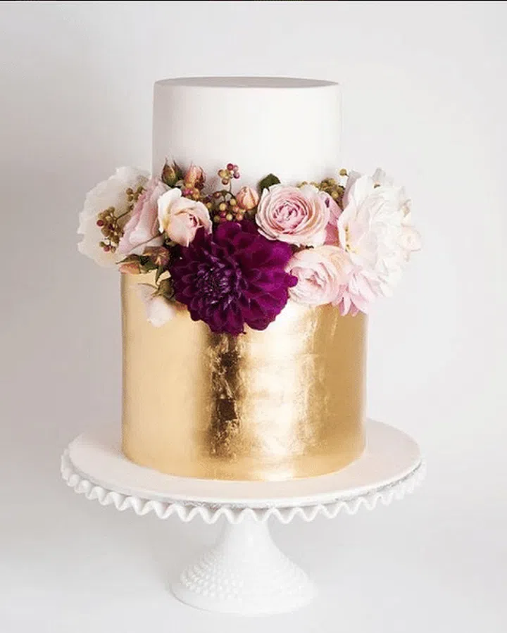 Who said metallic cakes had to be strictly limited to yellow or white gold? A softer pink- or rose-gold option is just as beautiful, if not more.