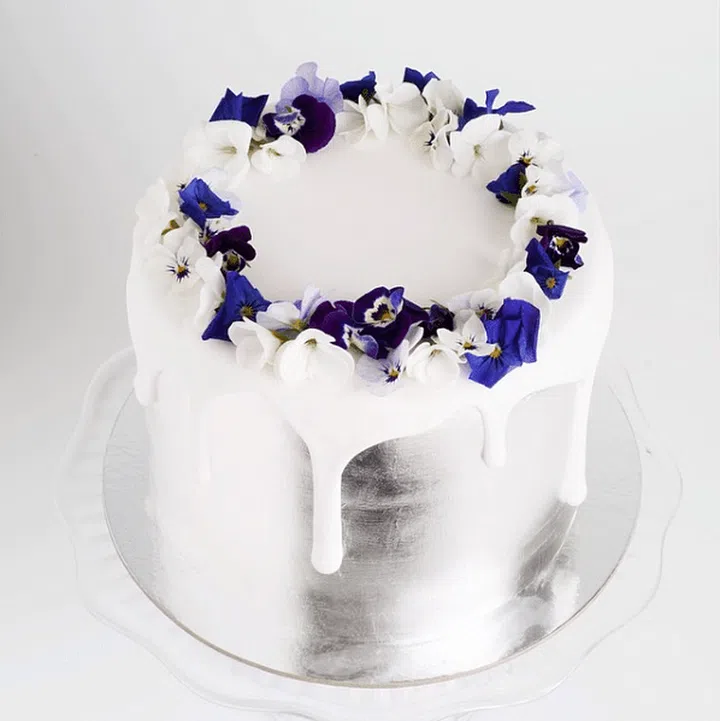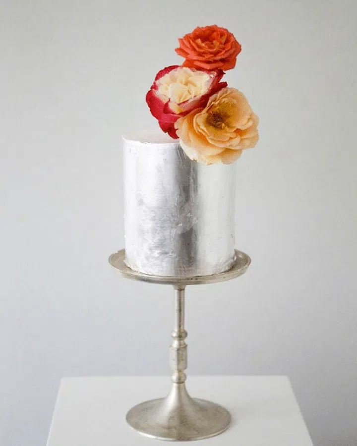 Perfect for a futuristic celebration tinged with romance: a silver cake with a ring of flower petals on top.