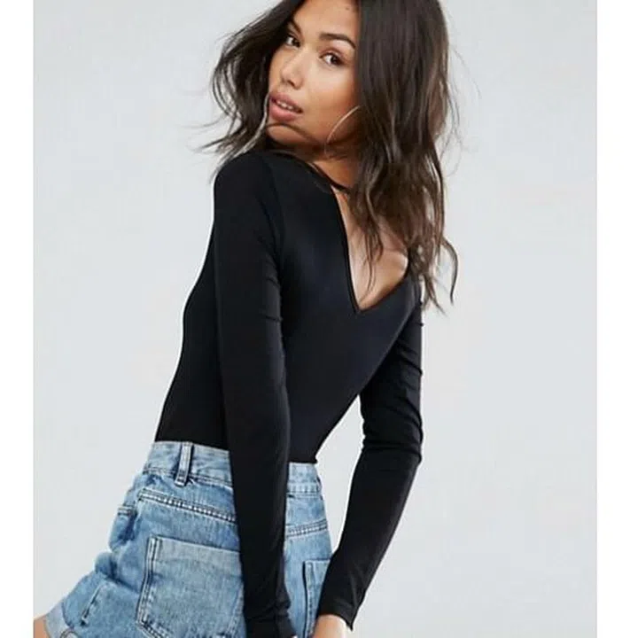 Running alone the vibes of ‘less is more’, we think there is nothing sexier than a plain black figure hugging top, tucked into figure hugging jeans. It allows your feminine charms speak for you, and shows your naturally confident with who you are. This long sleeved V neck bodysuit is a great example. Team it with a choker if you’re feeling a little extra, or if not, rock exactly as is.