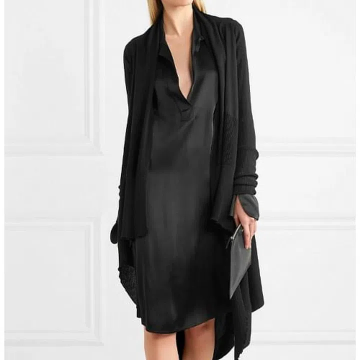 A long relaxed cardigan is an effortless way to layer up your blacks. This one is made from 100% cotton and has fitted arms and a draped shawl collar that flows down its skewed longline silhouette. Wear with your denim shorts and mules for weekend feels.