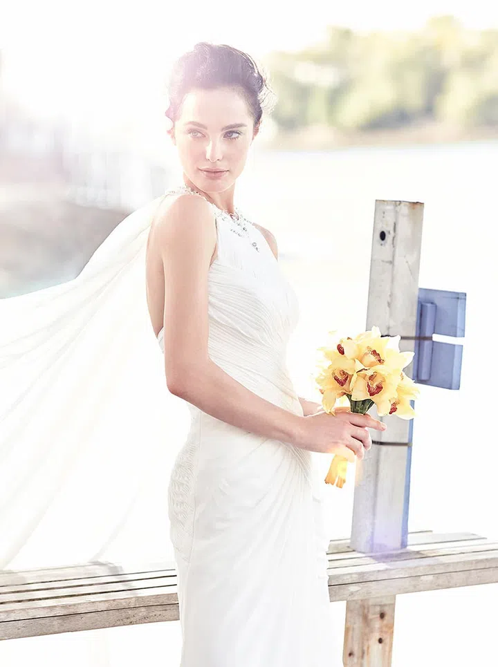 Chiffon, lace and polyester satin gown with chapel train, price upon enquiry, from DIGIO BRIDAL. Necklace, stylist’s own.