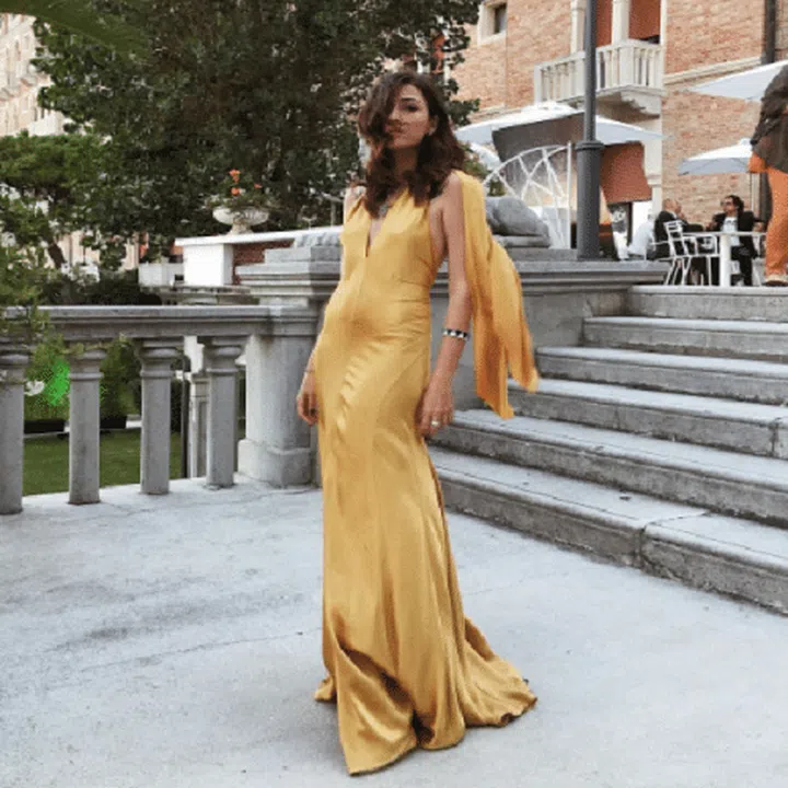 Italian concept store owner Eleonora Carisi looked ravishing in her figure flattering yellow silk dress from Alberta Ferretti.