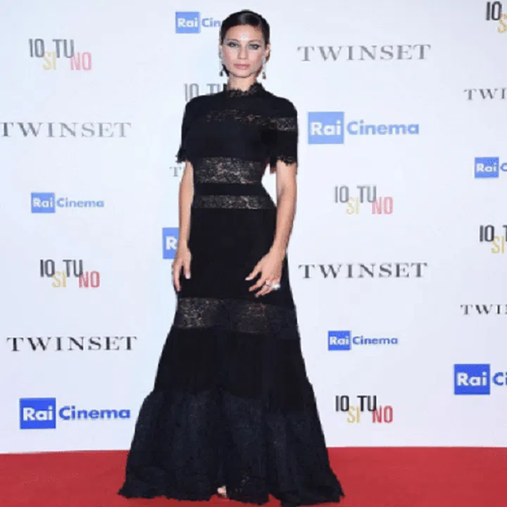 Marica Pellegrinelli turned heads at the premiere of the short movie “IO SI TU NO” in a black lacy piece by Twinset that highlights her figure in an understated and tasteful manner.