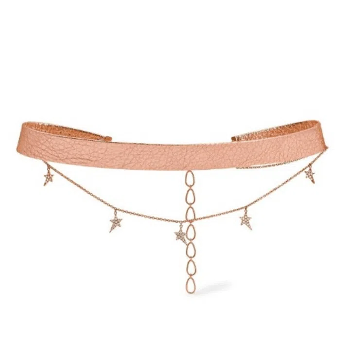Diane Kordas mixes fine jewellery with contemporary all in one piece and we’re so for it. The light golden metallic leather band is offset with a delicate golden chain that is adorned with diamond encrusted stars. For the star in your life this necklace will her perfect present.