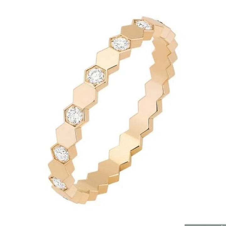 The Bee My Love collection from Chaumet, in homage to the emblem of Napoléon I, infinitely replicates the bee’s honeycomb motif. The geometric shapes, embellished with diamonds, pink, white or yellow gold, fit seamlessly together to mix and match around the fingers.
