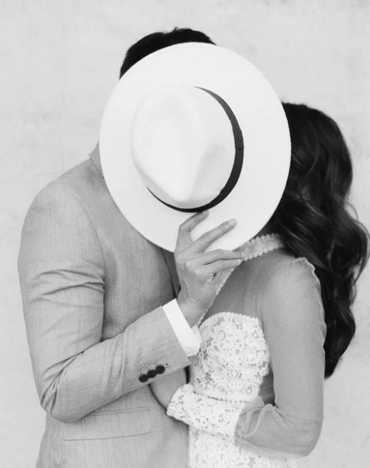 Leave a little to the imagination with this cheeky shot! Other props you can consider using: A book, her bouquet or even your hands! We love how the black and white filter (together with the fedora) lends a retro vibe, too.