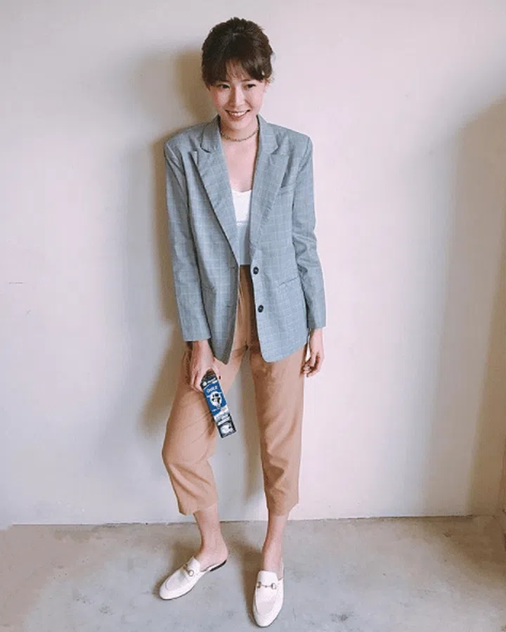 When you throw in a formal clothing piece like a blazer in a non-traditional cut like local actress Carrie Wong’s boyfriend cut blazer, you can keep the ensemble from looking so stuffy. For a more fashion forward look, complete the outfit with cropped trousers which are great for petite girls and some leather slides.