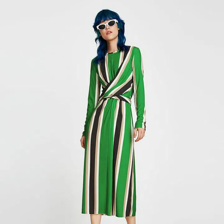 Vertical stripes elongate your body, ruching makes it look dressier than your standard little black dress and in an electric shade of green, it'll be hard to find someone else in the same one.