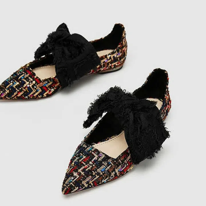 Ballet flats take us everywhere - to work, to parties and we even stow away a "walking pair" when we go on holiday. This pair is jazzed up with a print and a bow to make that walk just a little more enjoyable.