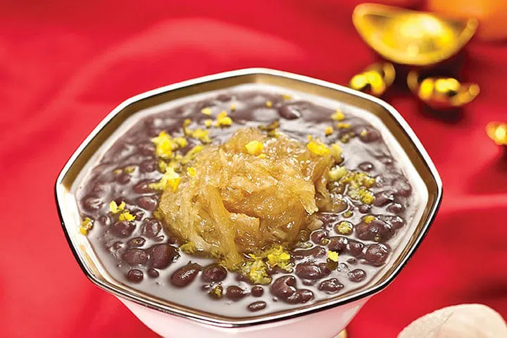 4. Pour the red bean paste into a bowl, add a scoop of bird’s nest without the syrup, garnish with orange zest and serve.