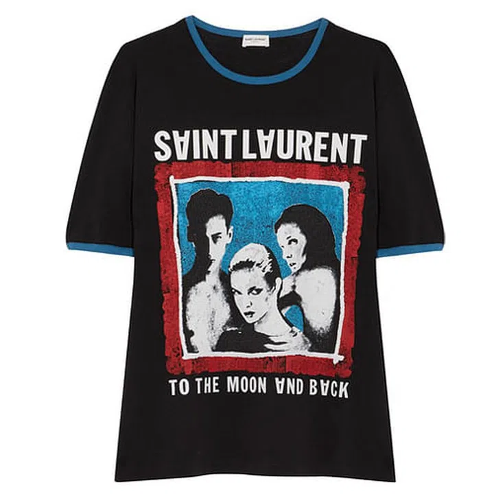 Saint Laurent's black T-shirt looks every inch a vintage band tee, from the blue ribbed trims to the distressed print front and center. The slogan 'To The Moon And Back Print' is seen on the shirt in overturned, reflected lettering alongside the brand’s logo. Wear this with a denim midi skirt for a vintage look.