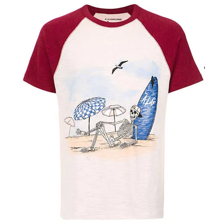 Classic raglan sleeves in contrasting colours always make a good solid graphic tee. Try this cheeky number with a satirical design of a sunbathing skeleton to add a bit of humour to your everyday outfit for a change.
