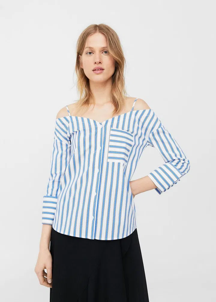Make your off-shoulder shirt more office-friendly by opting for one with straps. Style tip: bring out the black stripes in this shirt by pairing it with a black tapered pants.