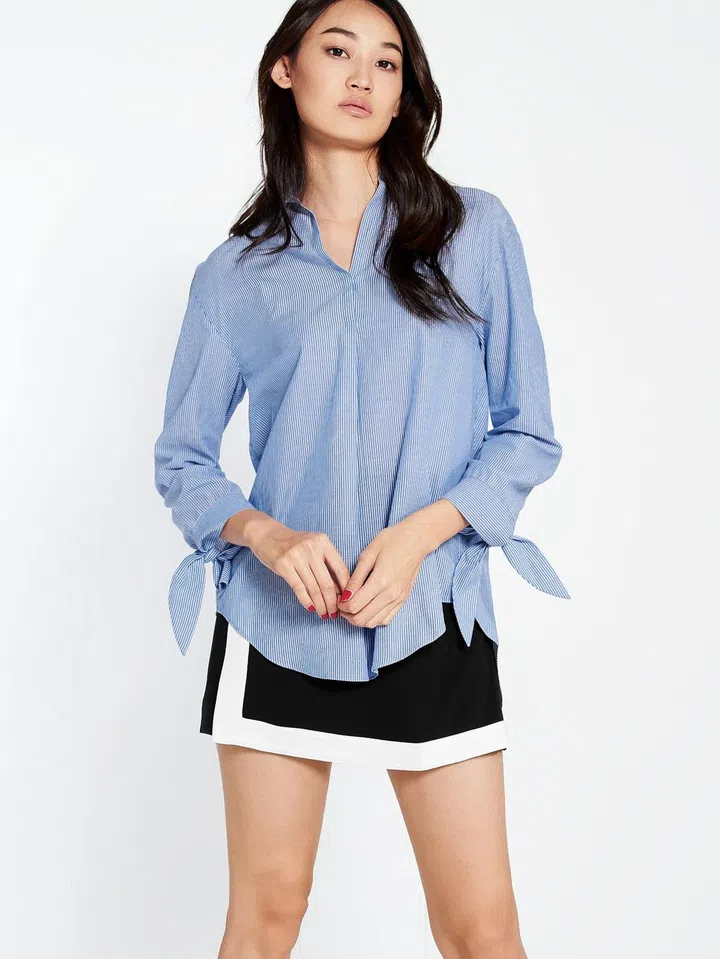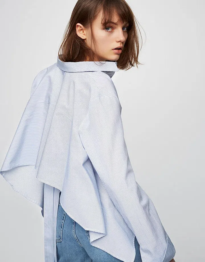 This seemingly normal work shirt has a bow detail at the back! Style tip: with so much texture and details on this shirt, you've probably reached your pizzazz-quota. So just pair it with a pair of hassle-free white wide-legged pants.